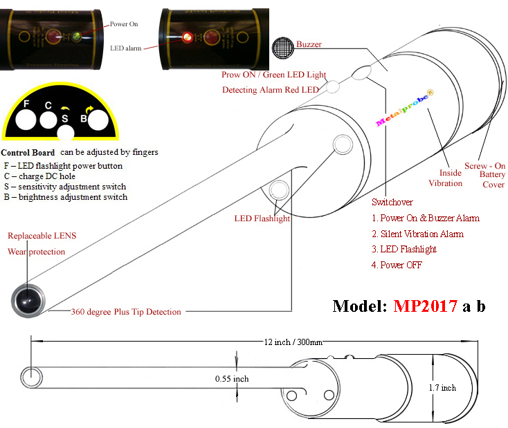 MP2017 has audible with LED and vibrating alarms to indicate the presence of metal objects.